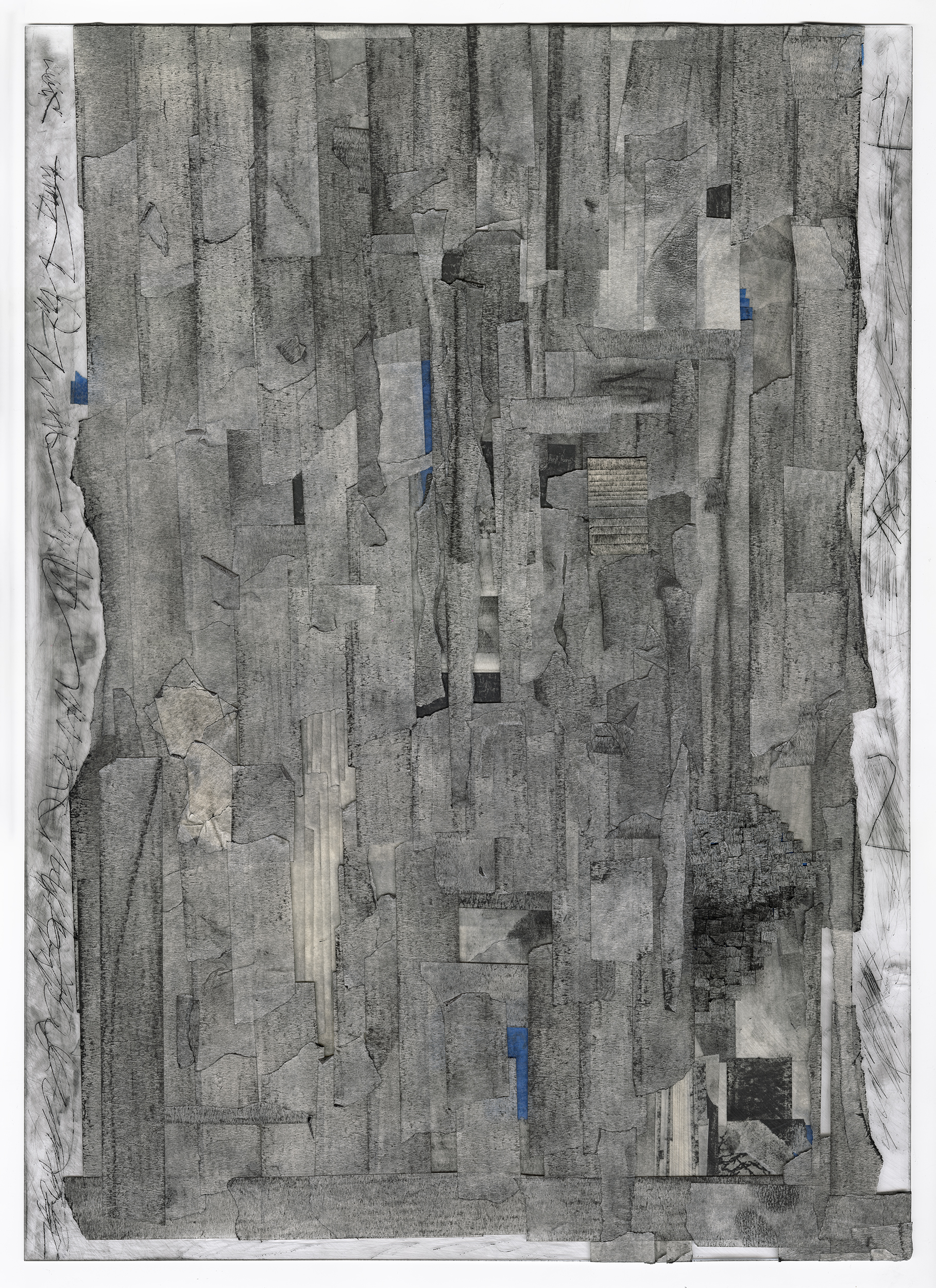 tracing paper, grey lead pencil, charcoal, staples, archival masking tape, clear embossed tape, ink, glue and cotton thread on glossy paper, artist frame