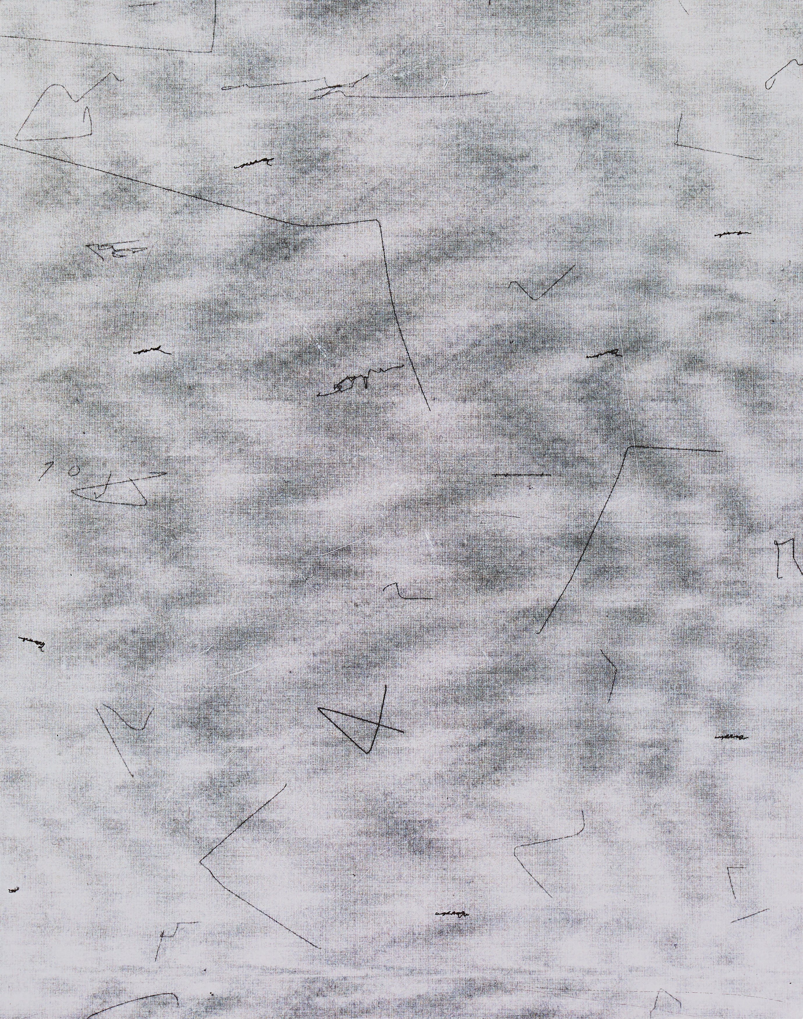 tracing paper, grey lead pencil, charcoal, staples, archival masking tape, clear embossed tape, ink, glue and cotton thread on glossy paper, with foamcore and corflute; artist frame