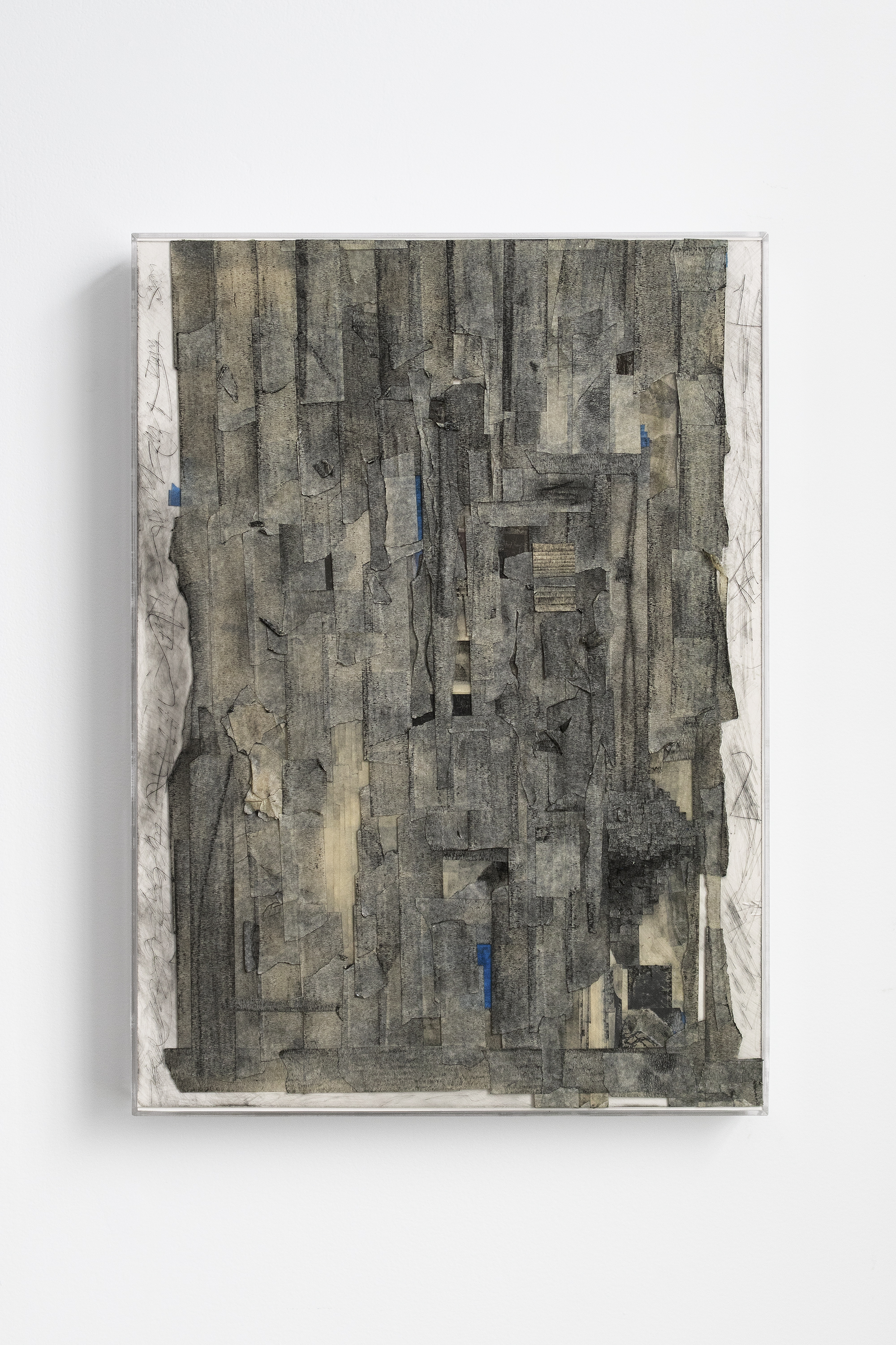 tracing paper, grey lead pencil, charcoal, staples, archival masking tape, clear embossed tape, ink, glue and cotton thread on glossy paper, artist frame