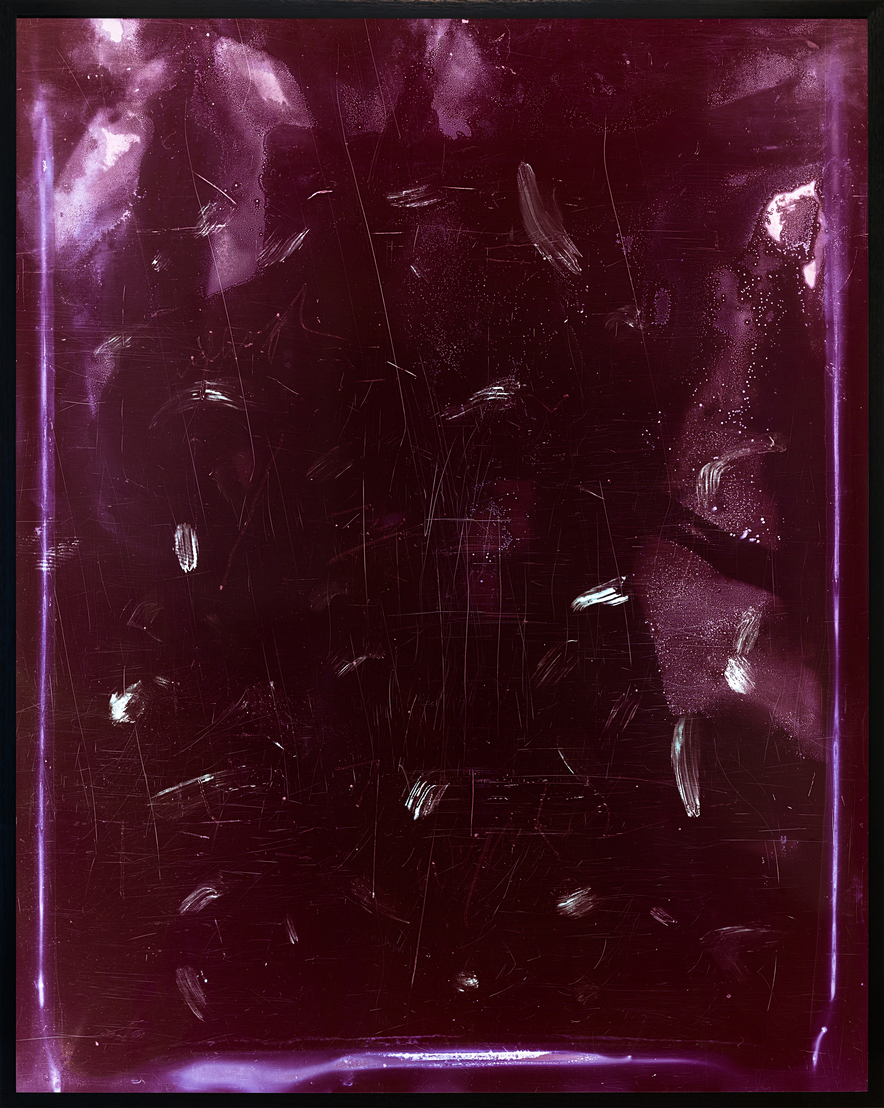 Literally translated from the Greek term, ‘living together’, the word ‘symbionts’ is used by Grabowsky to describe the co-dependence of analogue and digital processes in his photographic outcomes. Through a performative act of mark-making, and what the artist calls ‘conscious carelessness’, Grabowsky puts his photographic negatives through a physical process of rubbing, painting, drawing, printing, dipping, drying and spitting. The negatives are then re-printed in a dark room and further abstracted by photogram techniques. What results is a series of ambiguous gestures and images that are deliberately removed from their original context. Often associating his methodologies of texture to the act of cooking, the works’ surfaces can be read as soft or firm, crunchy or smooth.